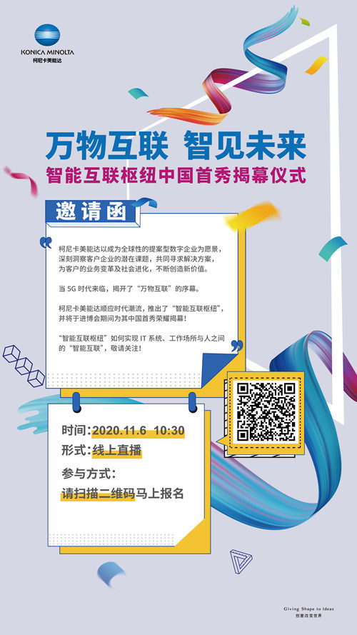 11月6日进博会现场,柯尼卡美能达将于 10:30在创业改变世界展区举行“万物互联,智见未来-智能互联枢纽中国首秀”揭幕仪式,届时柯尼卡美能达官方微信将进行同步线上直播,我们现在邀请您与我们一起在线观看,了解柯尼卡美能达的最新创新成果。