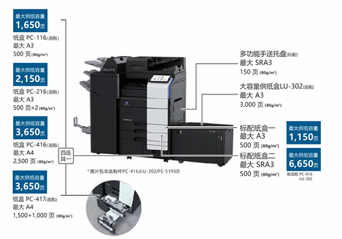 在纸盒设计上,bizhub 550i系列也进行了全面革新,由以往普通式大容量纸仓升级为内置式大容量复合纸仓,用户无需暂停正在运行的作业即可添加纸张。用户还可根据日常印量选择多层纸盒、大容量纸盒或侧置式大容量纸柜,进纸容量最高可达6650 页,可充分满足不同印量用户的需求。