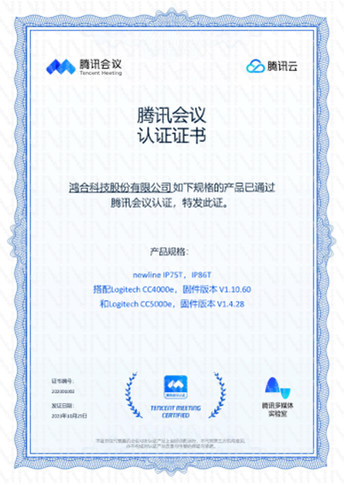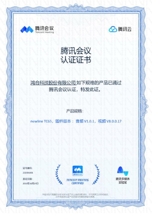 【IT168 资讯】近日,既newline TC65成为首款通过腾讯会议认证的云会议屏后,newline IP75T、IP86T也顺利通过腾讯会议认证,并颁发认证证书。腾讯会议认证是由腾讯云、腾讯会议联合腾讯多媒体实验室针对腾讯会议硬件厂商发起的专业的音频、视频认证,其测试规范可比肩国际权威音视频认证——Zoom和微软Teams,甚至某些标准还要更为严苛,同时腾讯会议认证也结合国内市场、厂商和用户的实际情况,使其既满足国际认证标准的专业与严格,又符合国内市场现状和用户需求。