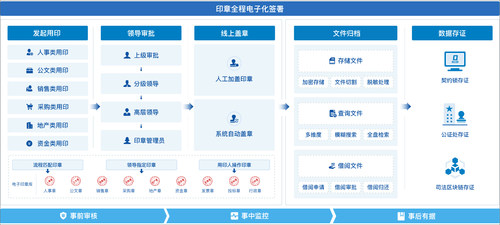 电子签名、电子印章、物理印章从制作、管理、使用、监控、授权、审计、停用、变更、废除等全生命周期过程,实现线上的统一管理闭环,解决传统情况存在的效率和安全性、成本等问题。