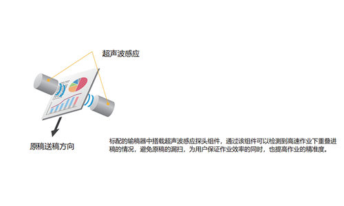 除此以外,ineo+450i输稿器其中,还搭配了超声波感应探头组件,通过该组件可以检测到高速作业下重叠进稿的发生,用户能够避免原件的漏扫,提升文印扫描的精确度。