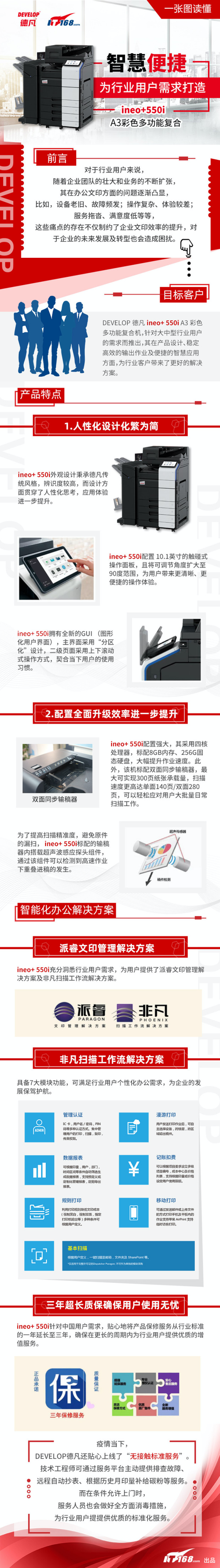 DEVELOP德凡ineo+550iA3彩色多功能复合机,针对大中型行业用户的需求而退出,其在产品设计、稳定高效的输出作业及便捷的智慧应用方面,为行业客户带来了更好的解决方案。那么今天,我们就通过一张图读懂的形式,为大家解决一下这款产品,希望能够为您未来的选购,提供一些有价值的参考。