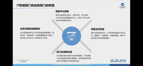而随着我们数字化的到来,现如今的IT科技已经渗透到了企业里面的各个层面,他们已经将我们的员工、客户、合作伙伴紧紧地关联到了一起,所以我们IT部门的职责、定位,已经开始转向为业务部门。而在这个转化过程中,IT部门又应该开展哪些工作呢?