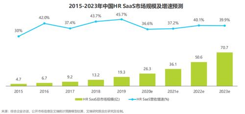 相比美国市场,中国由于公司基数更大、企业部署服务比例更低,HR SaaS整体市场潜力巨大。参考国内第三方数据调研机构iResearch艾瑞咨询发布《2020年中国HR SaaS行业研究报告》,数据显示,2019年HR SaaS市场规模19.3亿,预计未来三年市场增速仍将维持在35%以上,到2023年整体市场规模将达到70.7亿。