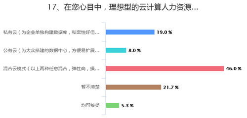 结合i人事此前发布的关于《中国中小企业数字化软件应用现状》的调研,问卷提出“您心目中理想型的人力资源软件部署方式?”超46%的调研者表示更青睐弹性高、操作灵活的“混合云”模式。伴随着客户不断衍生的新需求,具备公有云、私有云、混合云任选模式,且具备HR SaaS一体化的厂商,性价比更高,也更具发展潜力,在未来势必会一骑绝尘。