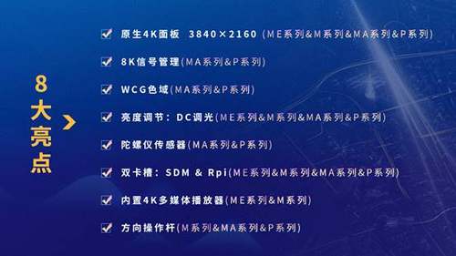 四大新品系列不仅保留了经典的温度传感器、颜色传感器、亮度传感器,可以对显示器的状态进行智能跟踪管理,实现机器内部温度的智能调节、颜色的精准调节,为客户带来便捷与更加安全的使用,让机器运行更加安全稳定;陀螺仪传感器还被创新性地应用在新品MA、P系列旗舰显示器上,提供了多种智能提醒功能,如当显示器受到外部撞击时会主动提醒、当显示器安装方向错误时智能提醒,显示画面以及显示器菜单能跟随显示器安装角度自适应旋转等功能,产品使用更加便捷智能。