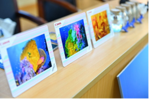 第一个环节是观看影展。在观展期间,小朋友们非常积极,不断地问工作人员海洋生物的问题,知识的问题,“海兔有多大呢?”“海马都是粉色的吗?”“我以后也要成为潜水员,去海底看看!”。本次活动使用支持方佳能的大笑墙结合海洋元素,制作了一个拍照装置,深受孩子们的喜爱,大家都争先恐后的合影。拿着佳能打印机TS8380输出的照片,孩子们脸上洋溢着无尽的喜悦。