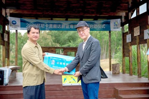 在启动仪式现场,炭谷忠彦董事长代表柯尼卡美能达向海口五源河湿地教育中心捐赠了爱心公益物资,用以支持教育中心的环保工作。