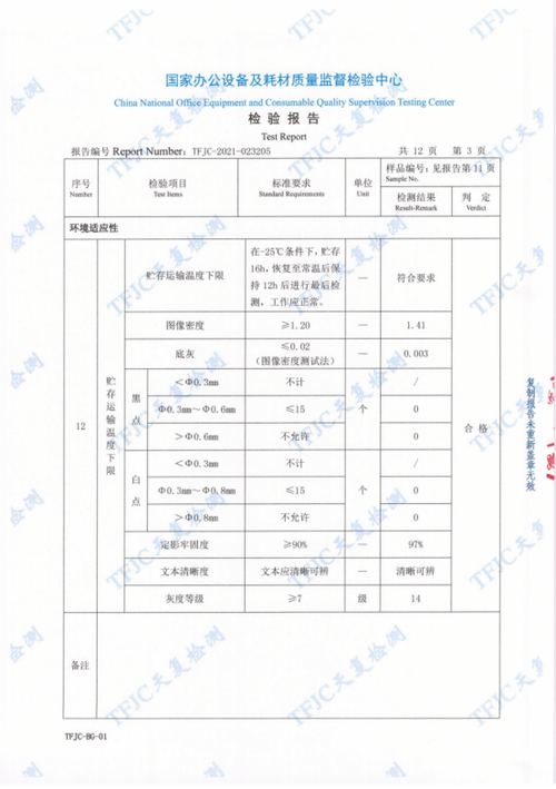 国家办公设备及耗材检验中心专门针对不同地区可能的存放情况,设计了高低温度、高低湿度不同条件的组合进行了测试,奔图PD-206在本次检测所设立的不同环境中都取得了优于国家标准的结果。