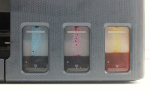 而在机身的正面,我们也可以看到两侧的墨仓容量,用户可以直观地看到其中一个墨水的使用情况,这样的设计也便于用户了解使用量,以便及时添加墨水,确保打印机的平稳使用。