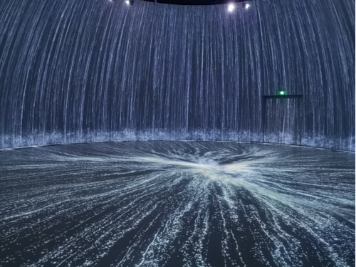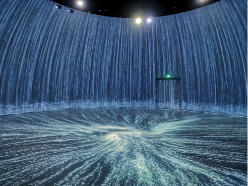 “飞流直下三千尺,疑是银河落九天”,大诗人李白描述的壮美奇景在这里“真实”再现。宛如蛋壳的球幕展厅里,巨型瀑布倾泻而下,似银河从天而降,并在地面迅速汇聚成河,波光粼粼、浩瀚无垠,令观者赞叹不已。得以呈现如此雄伟壮观的瀑布奇景,离不开20台NEC 4K激光投影机PX1005QL-B+的精彩演绎。巨型碗幕直径15.4米,高度5.9米,20台NEC PX1005QL-B+通过隐藏式安装,采用融合拼接的方式,分别在近百平方米的弧形墙面和圆形地面上进行投射,打造沉浸式互动投影,将观众带到“广阔无边”的水世界中,感受瀑布飞流直下的壮丽美景。