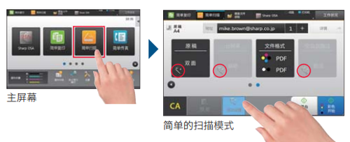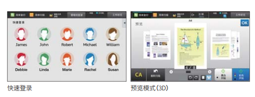 该机配备了10.1英寸彩色LCD触摸屏,该触摸屏使得复合机的操作变得既简单又直观。用户只需要轻触个人的专属图标或个人定制操作界面,就可以在简易用户界面模式下,找到预设功能图标,从而快速完成相关操作,用户体验进一步提升。