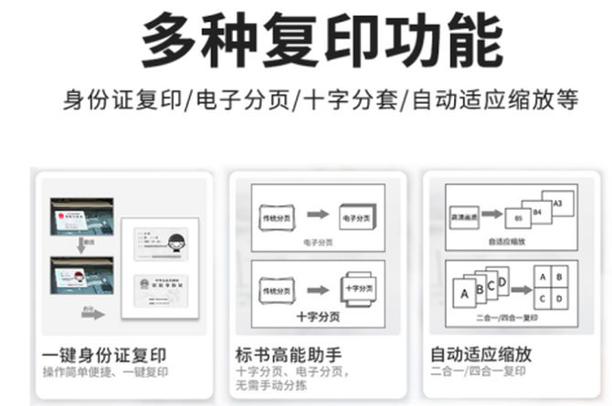 这款新一代复合机主张“更低成本,更多打印量” 内置双面功能内置双面模块实现高效双面复印打印输出,节省纸张消耗和存放空间,配合标配的RSPF双面自动送稿器,效率更高。以及多种简便实用的复印功能:身份证复印、电子分页、十字分套、移边、消边、自动纸张/缩放选择、自动纸盒切换、2/4合1复印等。
