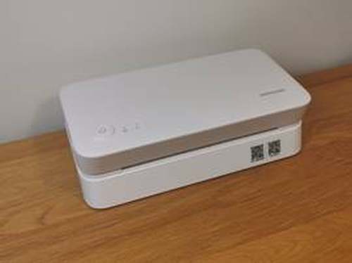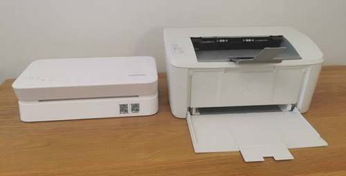 下图是喵喵机F1的外观,的确小巧,我这是拿了家中的某H牌,大品牌的桌面级黑白激光打印机做对比。小巧是显而易见的。当着这其中也有成像技术不同,造成的机身大小不同的原因。从使用上直观视觉确实喵喵机小巧的不是一星半点儿。