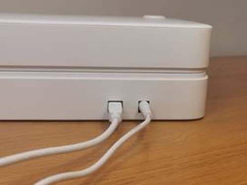 喵喵机F1的机身通体乳白色,流畅的弧形边角。外观上的接口相当简单,机身的上面是一个电源开关键和两个提示灯,两个是打开机身的卡扣,机身背面是电源插口和链接电脑的USB数据线插口。