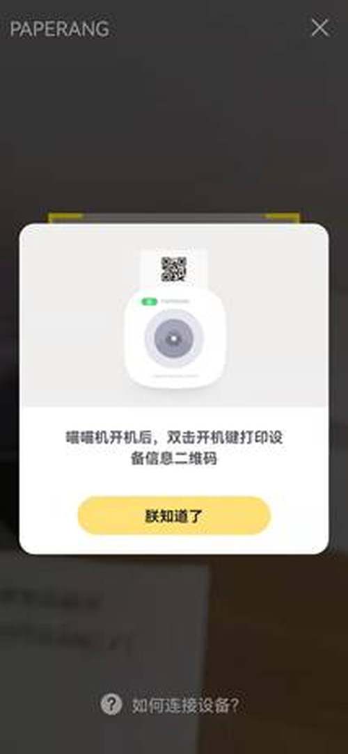 手机链接喵喵机F1需要双击电源开关,此时喵喵机会吐出一张带有二维码的纸,这张纸就是这款喵喵机F1的专属绑定二维码了,一个APP账号只能绑定一个喵喵机F1。