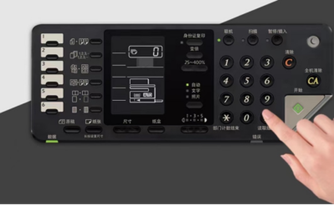 这款复合机采用图形化的操作面板,配置宽大,液晶显示屏清晰,按键的布局设置也很合理,使用时一目了然。用户可以实现机器配置和功能操作。控制面板的部分还可以设置常用的快捷操作按键。面板上的两个LED指示灯,一红一绿,清晰地呈现机器的工作状态。