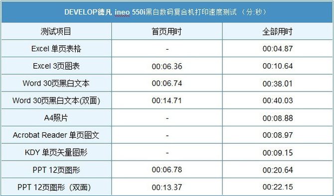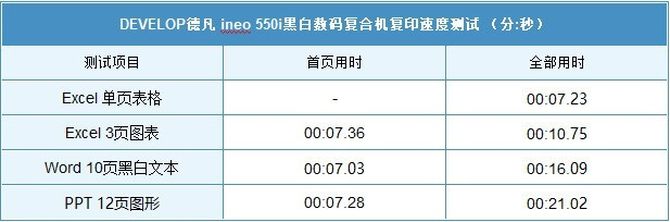 除了合理的内、外部设计,简单智能的操控大屏之外,DEVELOP德凡ineo 550i在性能方案也有着极佳的表现。经过我们的多次测试发现,DEVELOP德凡ineo 550i首页打印用时最快达到了4秒,十多页的文件也能够在30秒之内完成,整体速度达到了一流水平。