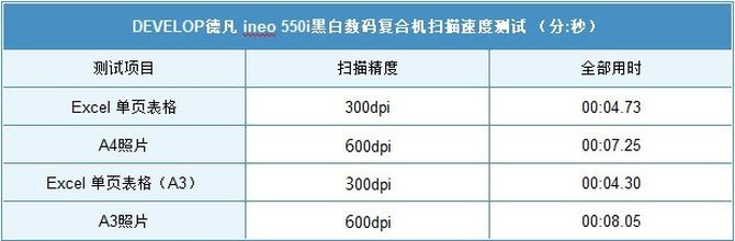 在扫描层面,在150dpi下单页A4文件仅用时4秒左右,几乎实现了“点击即可得”。在同类复合机产品中,DEVELOP德凡ineo 550i的扫描表现也处于高速阵营。
