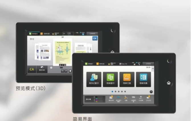 在操作设置方面,这款机器采用了7英寸的液晶操作面板,支持两点触控。提供了中文/英文/日文几种语言的显示,新型用户界面模式中,还有多种模式预览文件。