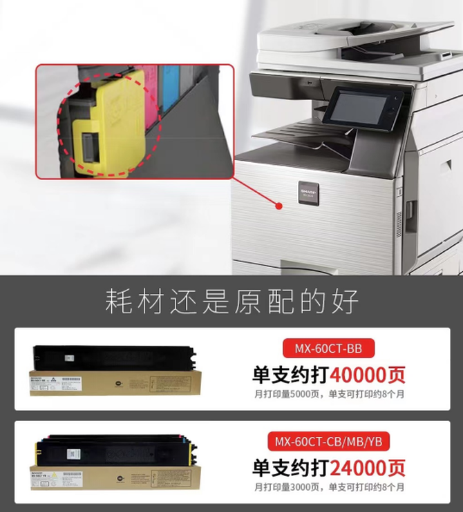 夏普公司一向支持环保,其中墨粉使用低熔点的材料填充,碳粉能够在低温下融化,从而降低了能源的消耗。并且墨粉用完的空盒将会自动弹出,不必担心没有提示的风险。这点是非常值得认可的。