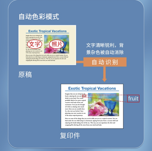 该机型提供了高质量的扫描和复印功能,彩色高性价比版标配自动色彩模式,可以精细的呈现文字、图片和地图;背景抑制自动消除不必要的背景色。