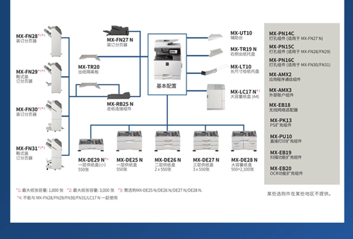 该款打印机标配双面输稿器+单层纸盒,同时可以灵活的增配各种供纸盒等,机型也有黑白办公入门级、彩色高性价比可选。
