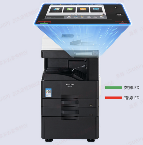 这款产品配备了7.0英寸超大彩色液晶触摸屏,并且提供了简易用户界面模式,用户可以通过简易模式,快闪实现复印、扫描、传真等功能。控制面板两侧底部红色绿色LED灯亮起,通知用户当前机器或作业的状态。简单明了。便捷了日常办公。