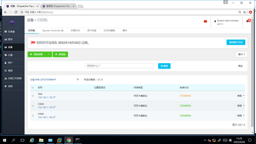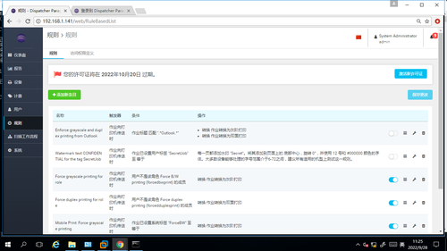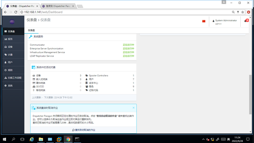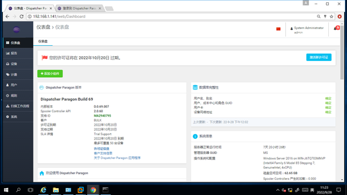 登录派睿(Paragon)文印管理解决方案主界面后,首先看到就是仪表盘页面,在这个页面上展示了该方案运行的当前版本信息、数据库的完整性信息、系统信息、系统服务、已打印作业等内容的实时统计,方便管理人员一目了然的了解目前整体系统运行情况。一旦出现问题,管理人员也可以迅速发现问题、迅速处理,确保相关设备运营的平稳。
