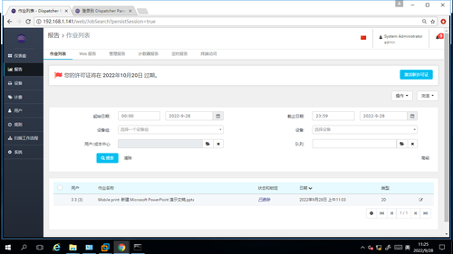 在报告页面,我们可以看到目前所完成打印作业情况,也可以根据企业内部自身需要来预设需求。简单说,企业可以通过系统来生成按照部门、时间、区间等条件,自动进行筛选生产数据报表,还可以根据预定义或定制化管理报表,并实现报表的定期自动导出。
