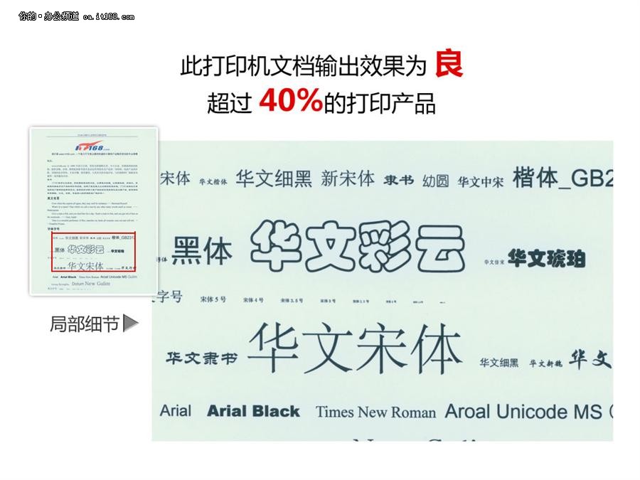 从文本测试样张来看,整体黑度充足,笔画清晰锐利,没有明显的碳粉飞溅现象。三星CLX-3186可以准确的表现各种字体,对于镂空等细节处也可以精确的体现。