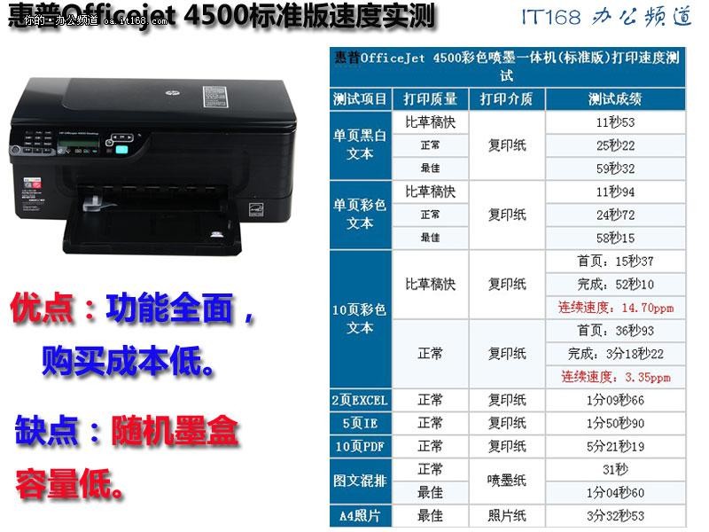 测试结果来源IT168专业评测中心:从测试结果上看,惠普OJ4500表现出了不错的连续输出速度和大容量文件处理能力,在EXCEL和IE等文件的输出方面表现出色。