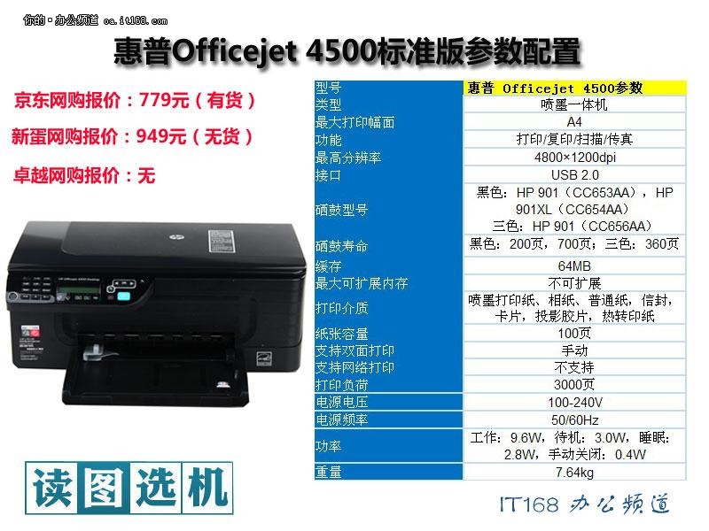 惠普OJ4500彩色传真一体机标准版支持打印、复印、扫描、传真等功能,非常适合中小型企业用户购买使用,完全能够满足企业用户的所有类型需求,机器官方报价为1499元,市场实际售价在千元以内,京东网上商城报价仅779元 ,非常适合注重成本的用户购买使用。