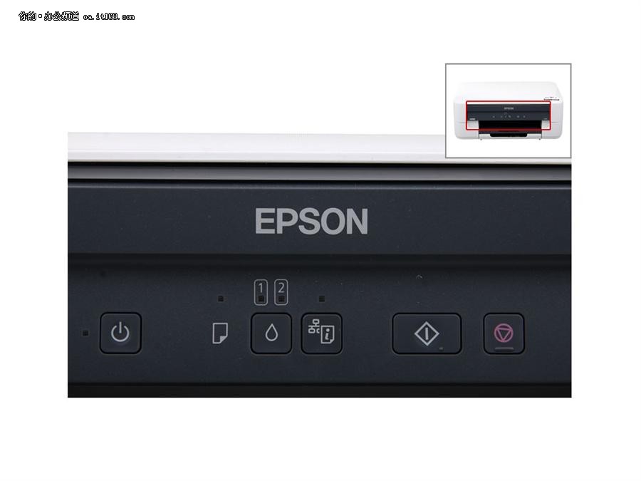 爱普生K200的控制面板设计比较简洁,由电源按键、更换墨盒按键、网络设置按键、复印按键、取消复印按键组成,另外,还有5个状态指示灯,分别用来提示电源、卡纸/缺纸、墨盒1错误/打空、墨盒2错误/打空、连入网络等打印机状态。