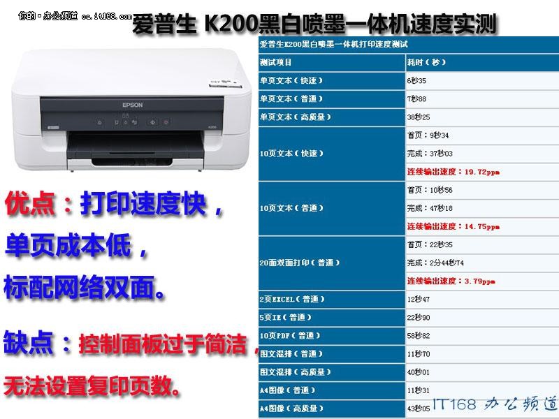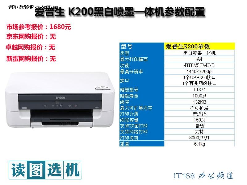 爱普生K200黑白喷墨一体机的官方报价为1680元,支持打印、复印、扫描等功能,与桌面级的黑白激光机价格相当,但是在这个价位上的黑白激光机通常功能比较单一,无法标配自动双面打印和网络单元。