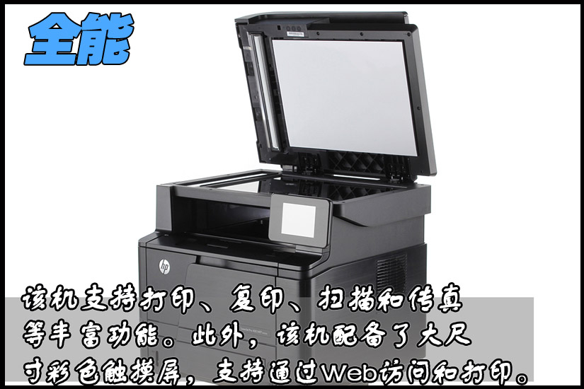 惠普M425dn黑白激光一体机,该机配备的超大尺寸触摸屏,反应灵敏,用户可以通过该屏幕,完成打印、扫描、复印、传真、U盘打印等多种功能。此外,联网的打印机还可以支持Web访问和打印。