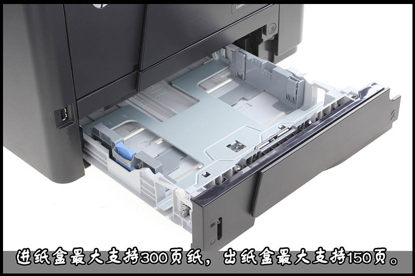 惠普M425dn黑白激光一体机,进出纸全部设计在机身前方,用户可以根据需要添加所需纸张。进纸盒部分,该机最大支300页纸张,出纸盒部分,该机最大支持150页纸张。